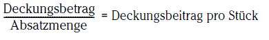 Der Deckungsbeitrag errechnet sich aus dem Preis des Gutes abzüglich seiner variablen Kosten. Er wird auch Produktdeckungsbeitrag genannt. Jedes Produkt, das veräußert wird, trägt zur Deckung der Gesamtkosten bei. Solange der Absatzpreis eines Produkts über den variablen Kosten liegt, wird zumindest ein Teil der fixen Kosten gedeckt. Aus diesen Überlegungen heraus baut sich die Berechnung des Break-Even-Punkts auf, der genau die Absatzmenge angibt, bei der die Summe der erzielten Deckungsbeiträge gleich dem Fixkostenblock ist. Oder anders ausgedrückt: Gesucht wird die Absatzmenge, ab der die Gesamtkosten gedeckt werden und ab diesem Punkt mit diesem Produkt ein Gewinn erwirtschaftet wird: Preis × Absatzmenge = Umsatzerlöse Umsatzerlös – variable Kosten = Deckungsbeitrag (DB) Der DB dient zur Deckung der Fixkosten.